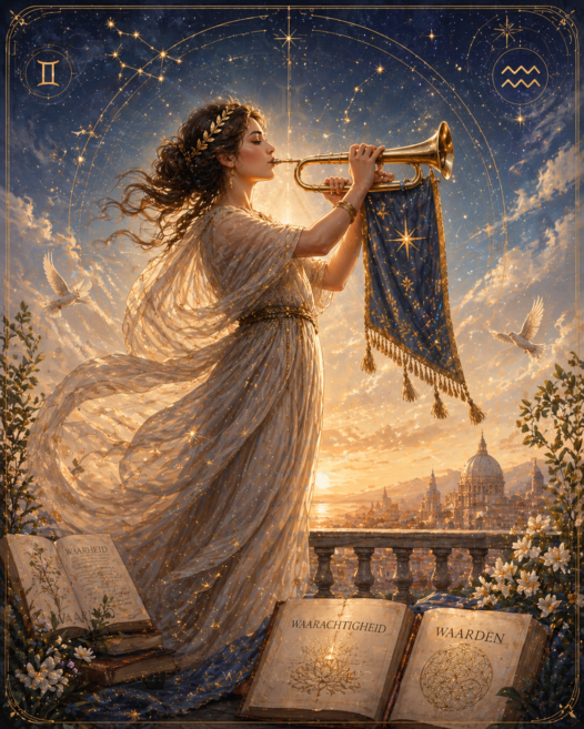 Het Sabian-symbool van de Noordknoop, “een meisje dat op een bugel blaast”, versterkt dit beeld van innerlijke roeping. Het is een symbool van expressie, van een zuivere toon die gehoord wil worden. Alsof er iets in jou is dat zich wil laten zien of horen, ook al is het nog niet perfect of volledig uitgewerkt.