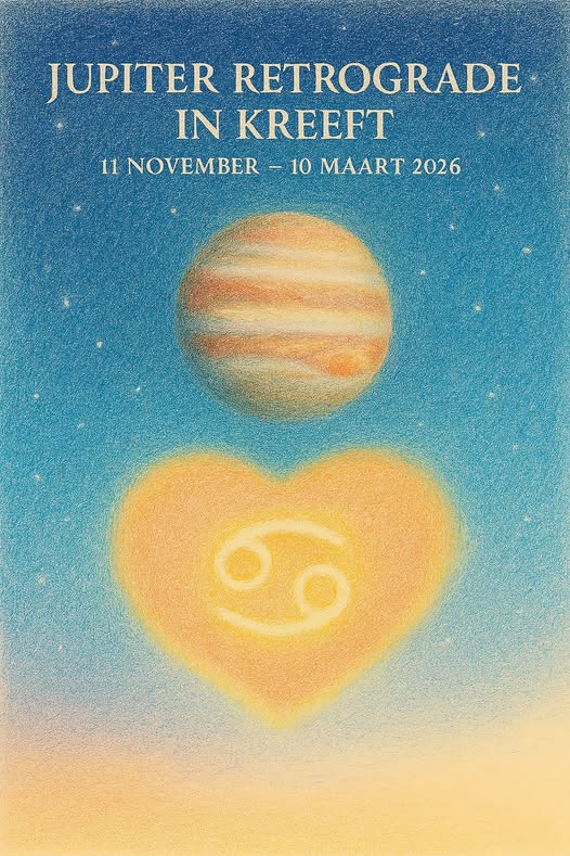Vanaf 11 november 2025 beweegt Jupiter retrograde door het teken Kreeft — een reis die duurt tot 10 maart 2026. Jupiter, de planeet van expansie, wijsheid en zingeving, keert zich in deze periode naar binnen.